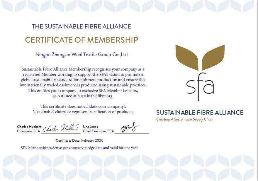 為推進羊絨產業(yè)綠色可持續(xù)發(fā)展,寧波中鑫經過前期準備、申請和認證,于2020年2月20日正式加入了SFA(Sustainbale Fibre Alliance)組織。