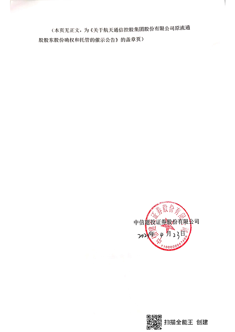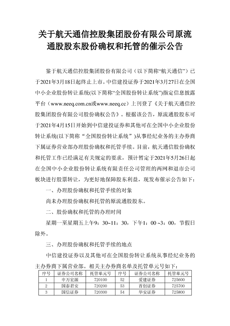 關于航天通信控股集團股份有限公司原流通股股東股份確權和托管的催示公告