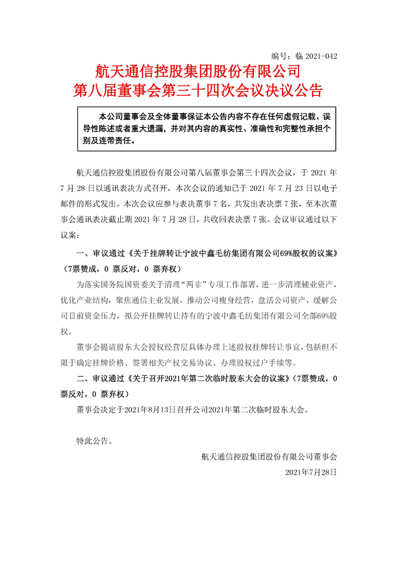 航天通信控股集團股份有限公司八屆三十四次董事會決議公告