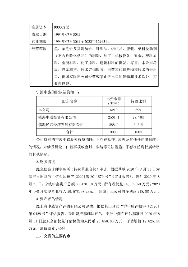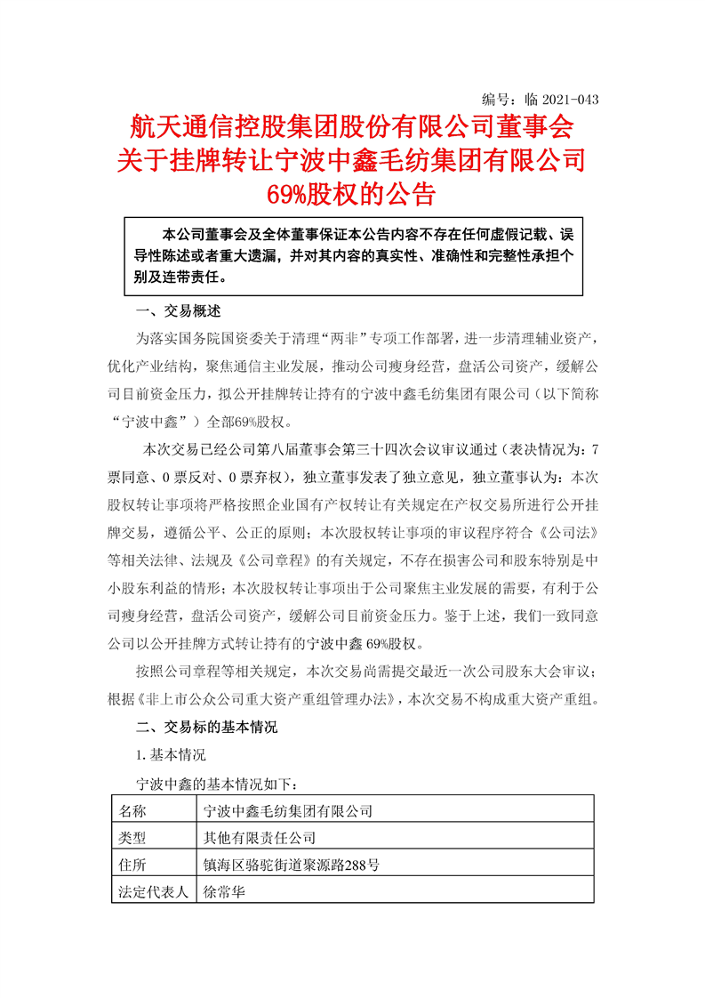 航天通信控股集團股份有限公司關(guān)于掛牌轉(zhuǎn)讓寧波中鑫毛紡集團有限公司69%股權(quán)的公告